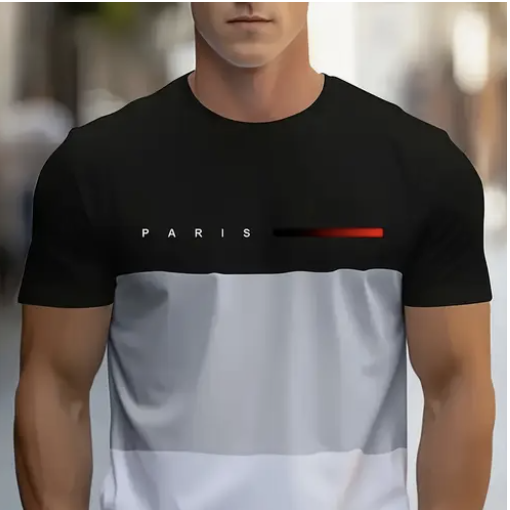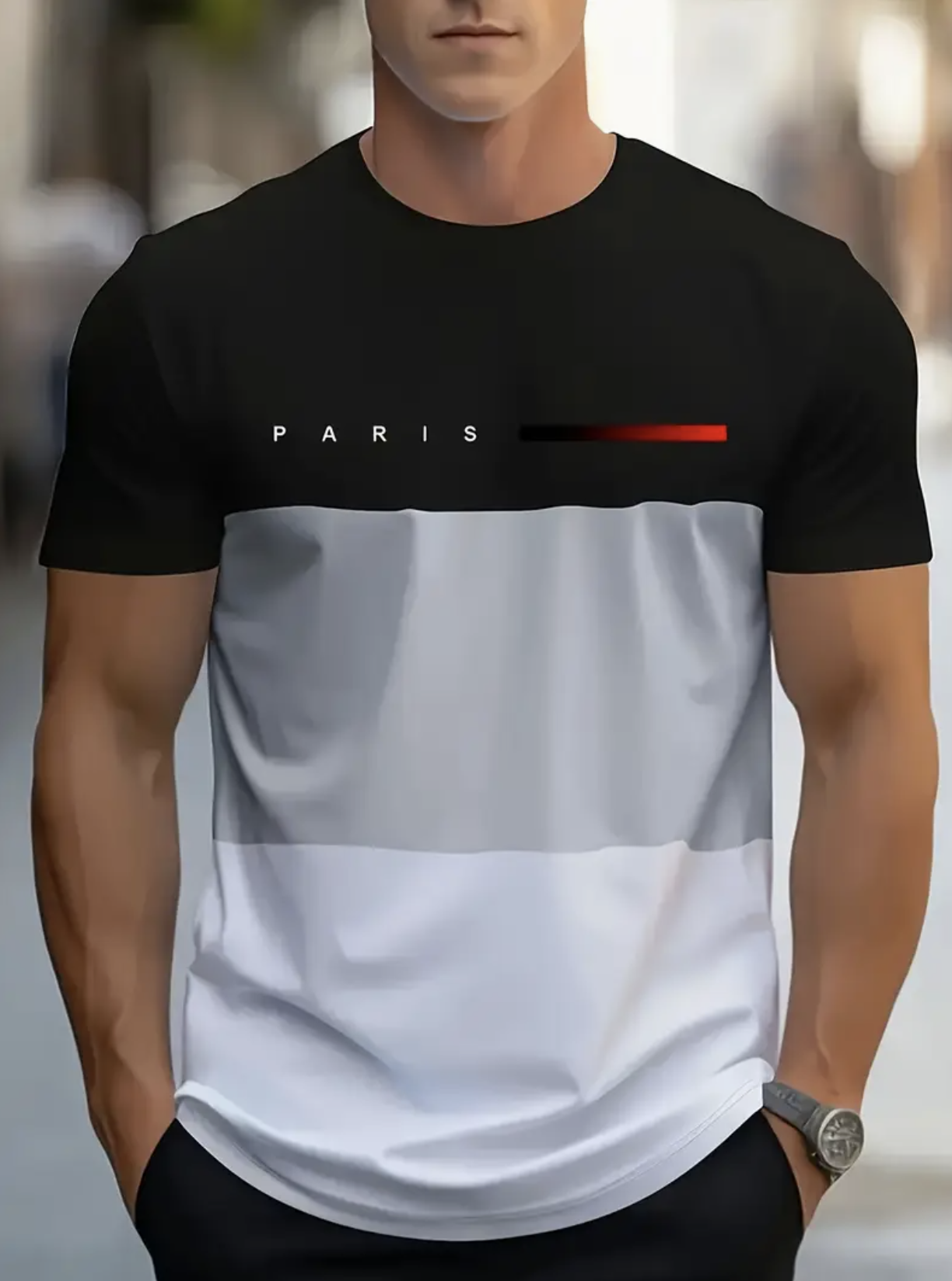 Men’s Paris-Inspired 3D Print T-Shirt – Stylish Two-Tone Short Sleeve with Eiffel Tower Graphic, Casual Round Neck, Polyester Blend, Perfect for Summer Leisure